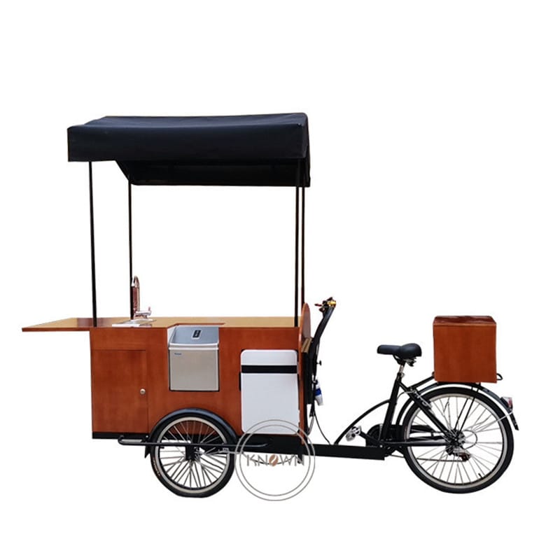 Brown Mobile Coffee Carts Bike Outdoor Kiosk with Portable Ice Maker Electric Bicycle Ice Cream Freezer Food Vending Cart